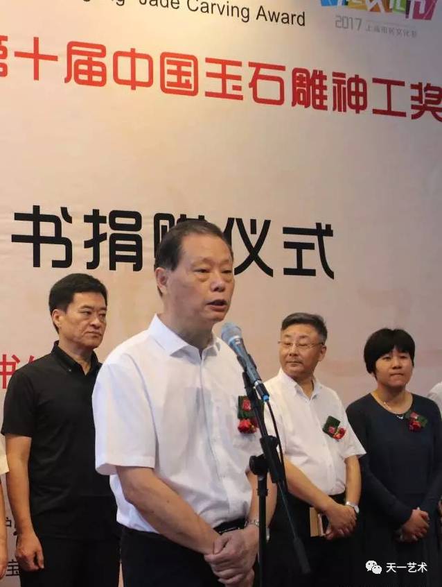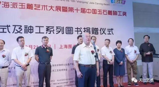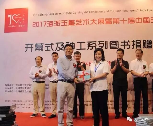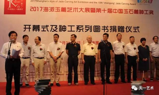 2017海派玉雕艺术大展 暨第十届中国玉石雕神工奖 开幕 金秋结硕果,神工谱新篇。在全国上下喜迎党的十九大胜利召开之际,上海迎来了一场特色的玉界盛会。9月21日上午,2017海派玉雕艺术大展暨第十届中国玉石雕神工奖在上海图书馆隆重开幕。本次活动由中国轻工珠宝首饰中心、上海市文化广播影视管理局作为指导单位。上海海派玉雕文化协会、中福古玩城主办。 开幕式由上海海派玉雕文化协会副秘书长周祥康主持 上海海派玉雕文化协会会长孙敏致辞 上海海派玉雕文化协会会长孙敏在致辞中首先向各位嘉宾的光临表示热烈的欢迎和感谢,孙敏会长表示:“十届神工奖是一个重要的历史节点,肩负起振兴海派玉雕的重任。十年来,在全国各地玉界领导、玉雕大师、玉雕收藏家、玉雕爱好者和媒体的支持帮助下,神工奖已从小到大,从上海及长三角的地方性奖项,发展成为全国性的重要奖项;从单一奖项发展为和品牌博览、艺术大展结合的综合性、规模化展会。”他提到,回首过往,成绩来之不易。十年来神工奖的发展成就,需要玉界同仁同心协力,共谋发展。办好神工奖是海上玉坛人士的共同职责。希望大家在振兴海派玉雕的共同目标下,通力合作,各显其能,共同振兴发展海派玉雕文化事业。 上海市非物质文化遗产保护协会会长高春明 上海市非物质文化遗产保护协会会长高春明在开幕式上预祝第十届神工奖取得圆满成功并致辞表示:“海派玉雕经过不断的探索、创新、突破,神工奖系列活动已打造成为非遗活态传承的平台,玉界名家展示风采的舞台和玉坛新秀锻炼成长的园地,充分展示了品牌价值。他寄语说:“作为国家级非物质文化遗产项目的海派玉雕,在今天,我们更加需要总结经验,紧跟时代,立足长远。共同寻找新十年发展之路。” 上海市收藏协会副会长陈克涛 上海市收藏协会副会长陈克涛代表上海市收藏协会对神工奖十周年表示祝贺,他在致辞道:“现今,神工奖已是海上文化百花中的一朵奇葩。十年来,神工奖一步一个脚印,海纳百川、追求卓越、不断创新,相信神工奖会为文化强国、为大国工匠走向世界做出贡献。” 第十届上海市政协秘书长杨奇庆宣布展览开幕! 图书 1 捐赠 -THE FIRST- 开幕式上中国玉石雕神工奖组委会还向上海图书馆捐赠神工奖历届作品精选集等书籍。 自2007年9月海派玉雕文化协会首创玉石雕神工奖,十年间,神工奖都以不懈的追求昭示自己的形象。2017海派玉雕艺术大展暨第十届中国玉石雕神工奖,将当前玉雕界发展成果充分展示,将进一步激发玉雕创作者和从业者的创作热情,坚定不忘初心、继续前进的信心和决心,以优异的创作成绩迎接党的十九大胜利召开。 指导单位: 中国轻工珠宝首饰中心 上海市文化广播影视管理局